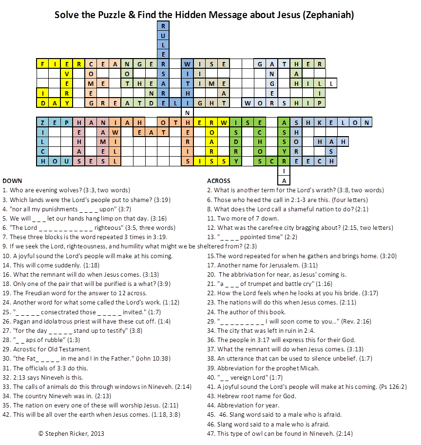 * The crossword puzzle contains a hidden message. The answers come mostly from the book of Zephaniah. To print out right click over the puzzle and pick "View Image" or "Print". This should bring up a new window from where you can pick "File" and then "Print". Click here fore the answer.